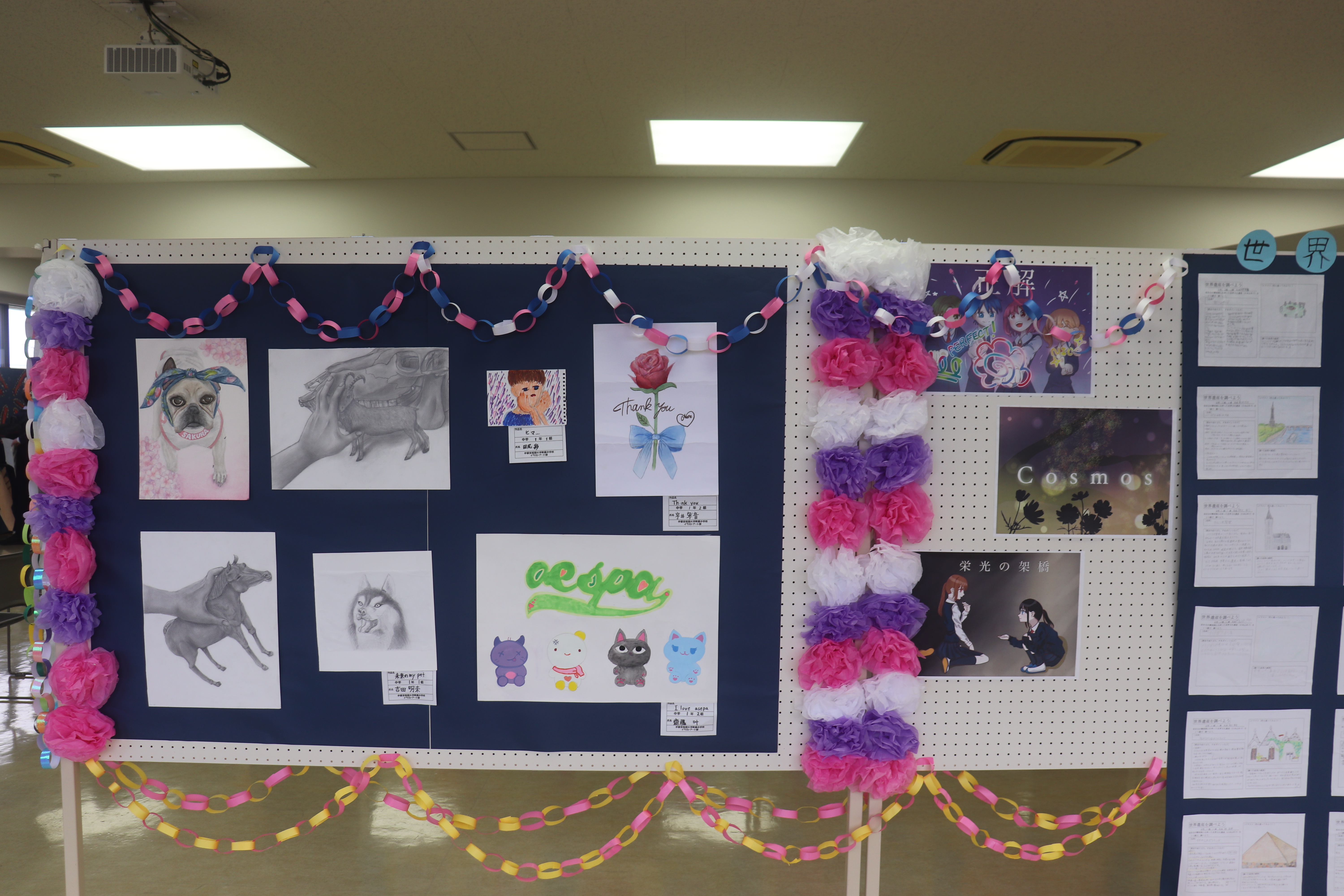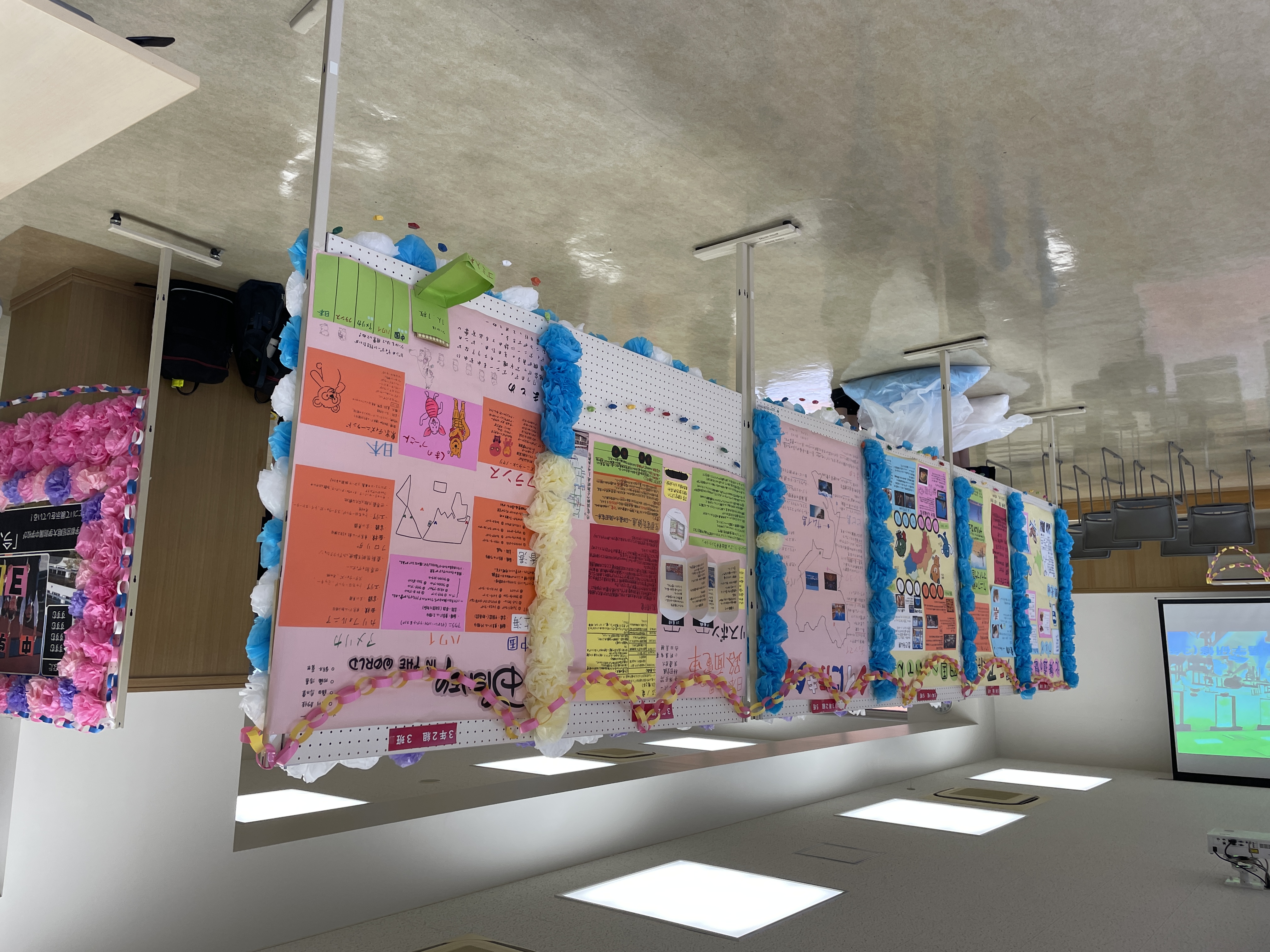 クラス展示は「いま話題の〇〇」をテーマに、1年1組は「いま話題のコンテンツ」, 1年2組は「いま話題の生活用品」, 2年1組は「いま話題の食べ物」,2年2組は「いま話題の文房具」, 3年生は「いま話題の観光地」について、まとめて発表しました。