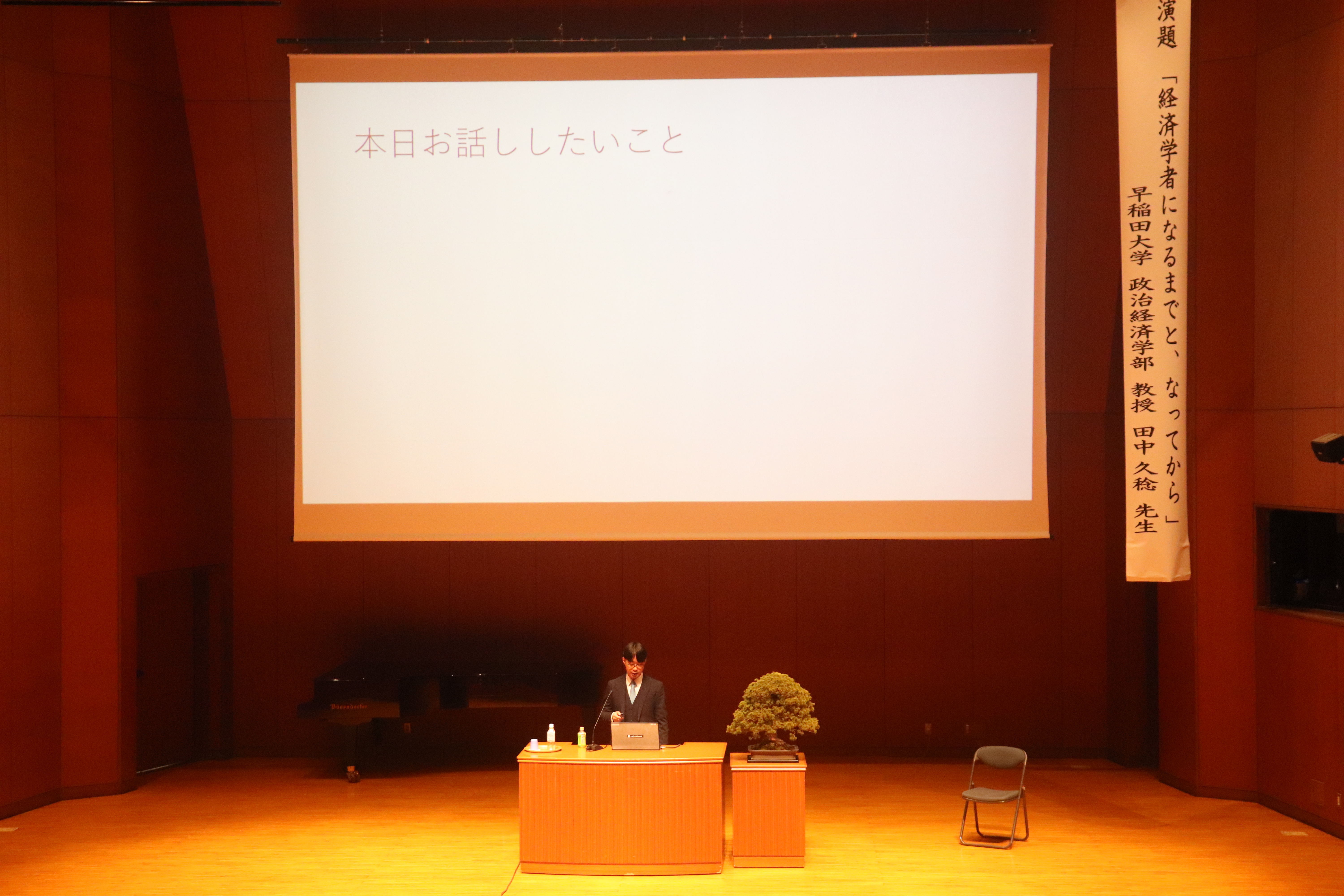 記念講演では、本校中高一貫卒業生で早稲田大学政治経済学部教授の田中久稔先生をお迎えし, 「経済学者になるまでと, なってから」という演題でご講演をいただきました。日常生活の中にある出来事を経済学と結び付けたお話があり, 生徒たちは経済学を身近に感じながら興味を深めることができました。また, 進路を考える上で「好きなことではなく、得意なことを大切にする」という先生の言葉は, 立志式を迎えた2年生にとって大きな示唆となっただけでなく, 他学年の生徒にとっても, 自身の将来について考える貴重なきっかけになったことと思います。